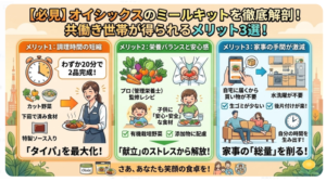 さおり:でしょ?買い物に行く「移動時間」と「重い荷物を持つ労力」、そして食後の「洗い物の手間」。この3つの工程が劇的に減るだけで、夜の自由時間が30分は増えるわよ。